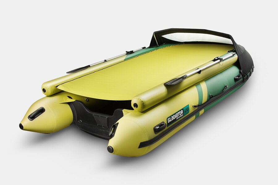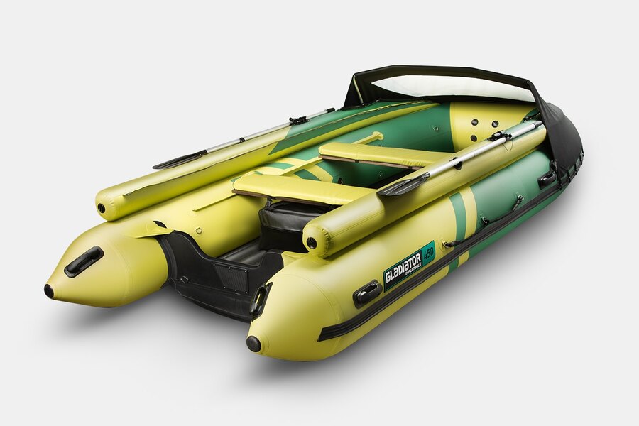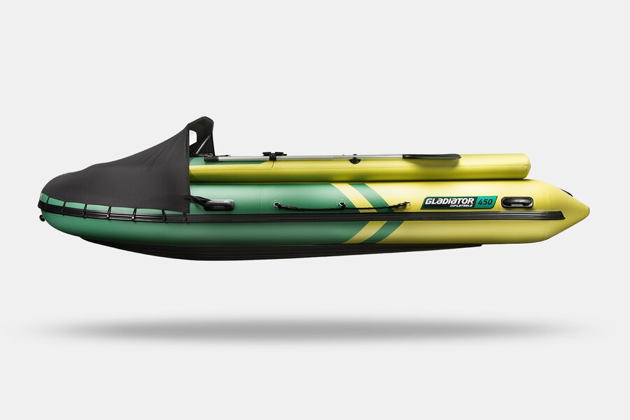 Используемый для лодок GLADIATOR материал состоит из пятислойного армированного ПВХ. Данный материал представляет собой синтетическую плетеную основу с полимерным покрытием, а использование композиционного поливинилхлорида и пластифицирующих добавок обеспечивает высокую прочность и устойчивость к порезам и проколам. Швы выполнены по уникальной технологии — каждый шов собран «внахлест», прошит и проклеен специальным клеем для ПВХ изделий. Каждый шов усилен проклейкой в четыре слоя из полос специальной ткани для придания швам эластичности, максимальной прочности и долговечности.